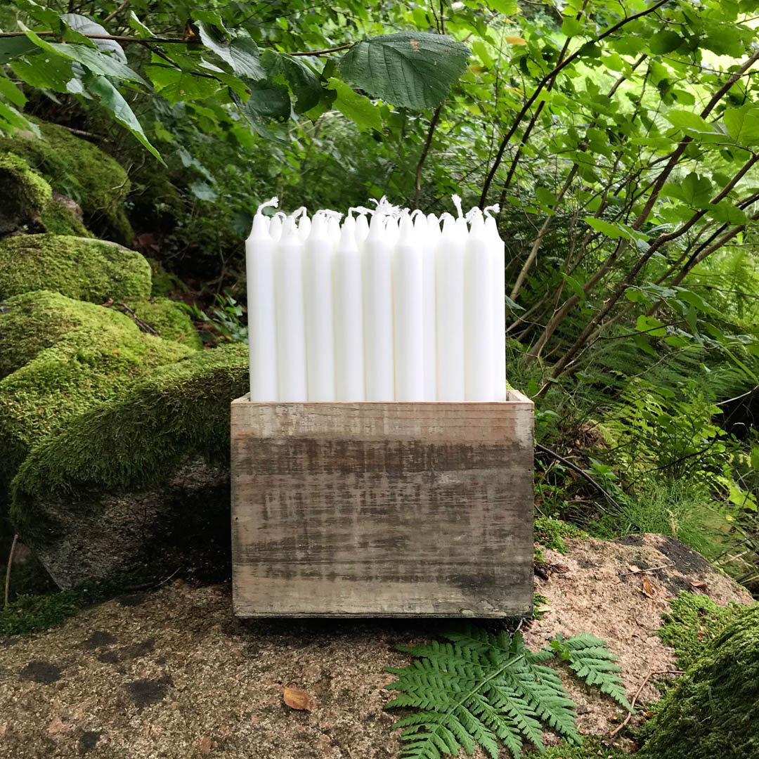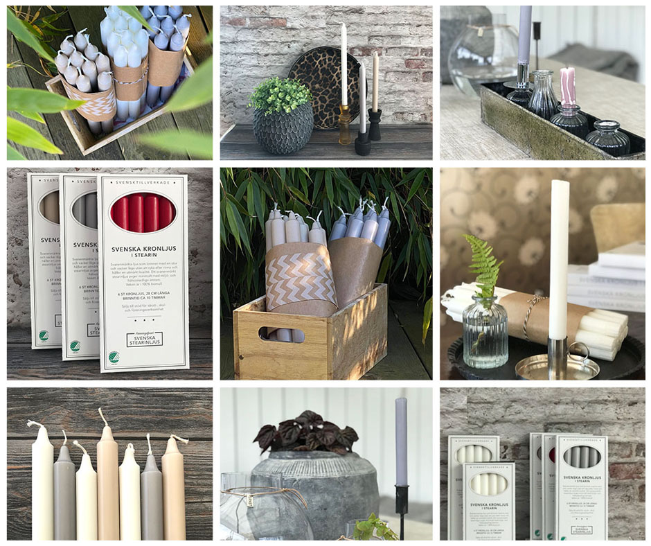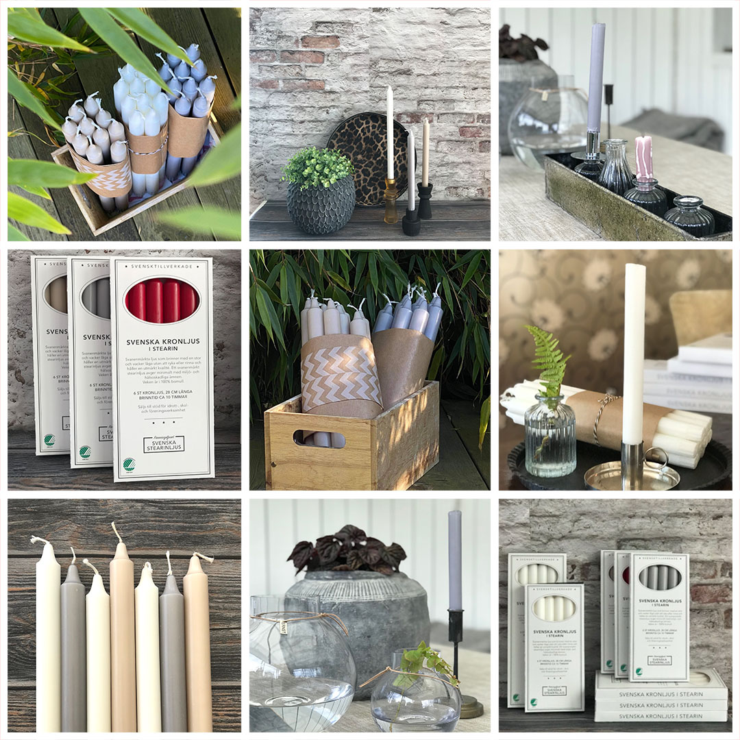 Svanenmärkta ljus som brinner med en klar och vacker låga. Ljusen består av stearin vilket är en förnyelsebar råvara. Veken är i 100 % bomull. Ett svanenmärkt ljus bidrar inte till växthuseffekten och innehåller inte palmolja eller palmvax.